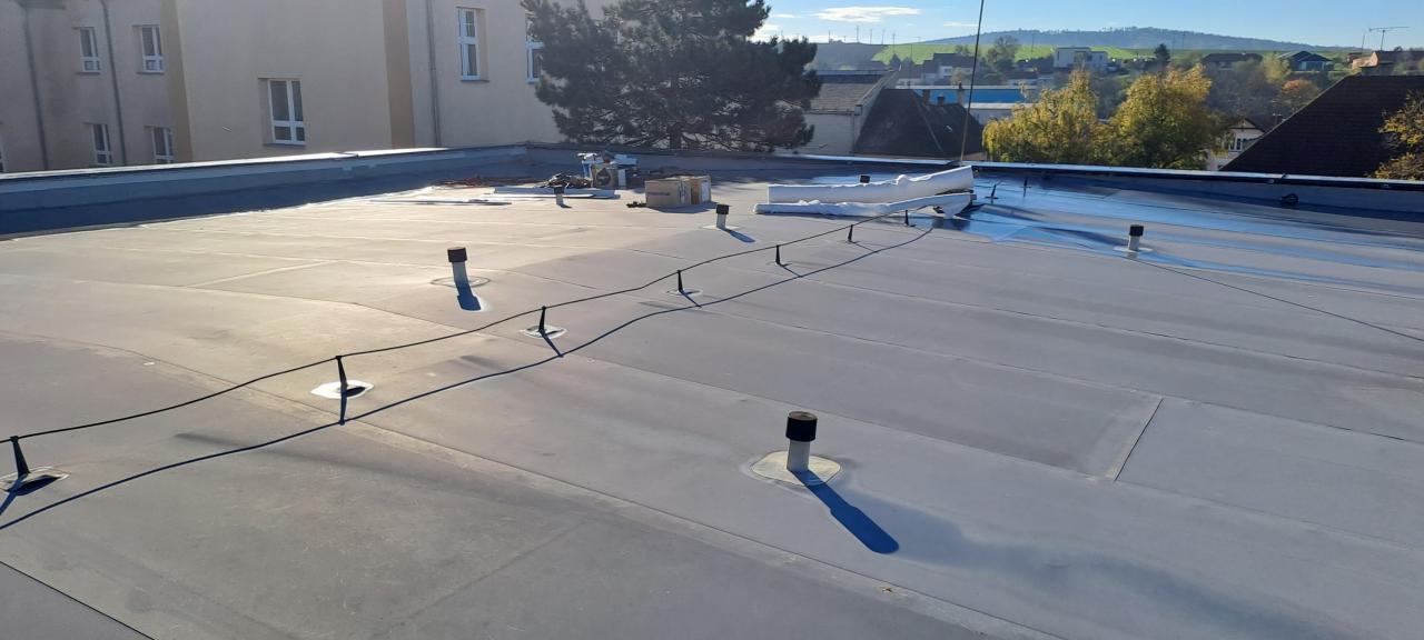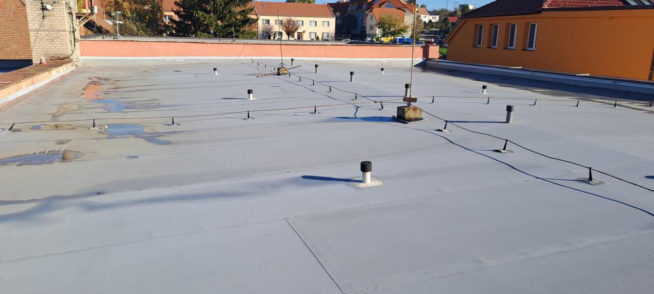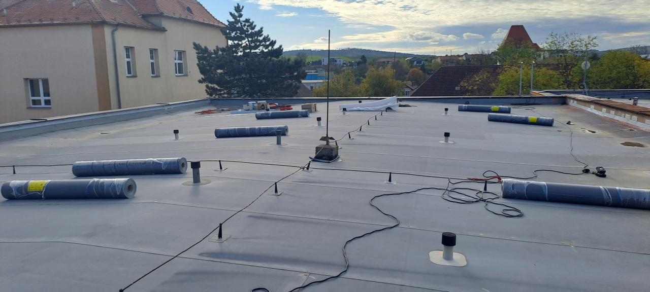 Při defektoskopii bylo zjištěno velké množství závad, dochází k zatékání, a proto RM rozhodla o opravě. Bude vyměněna stávající geotextilie, fólie střechy za novou Fatrafol 810 tl. 1,5 mm, větrací komínky, kterých kvůli zjištěné vlhkosti přibude na více než třicet kusů, polystyrenové desky budou vyrovnány a dle potřeby doplněny. Stejně tak bude provedeno oplechování z poplastovaného plechu či řešení všech detailů tvarovkami. Práce provádí odborná firma RT izolace z Nedakonic.