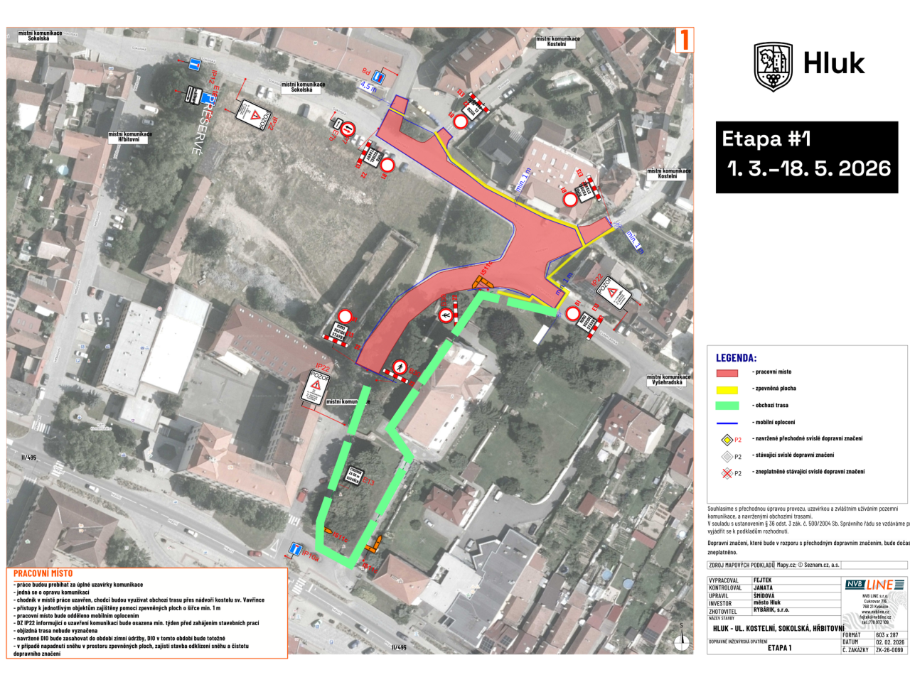Etapa #1 bude začínat 1. 3. a potrvá do 18. 5. Jedná se o ulici Kostelní od základní školy přes křižovatku u ZUŠ do ulice Sokolské k bývalému komunálu. Cesta z Vyšehradské ulice ke škole a na náměstí povede napříč parkem u kostela a kostelními schody dolů.