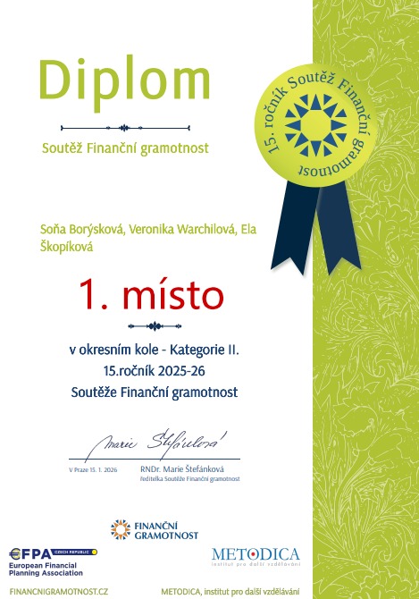 Žákyně Ela Škopíková, Veronika Warchilová a Soňa Borýsková uspěly v 15. ročníku soutěže Finanční gramotnost a postoupily do krajského kola. Gratulace a palec nahoru.