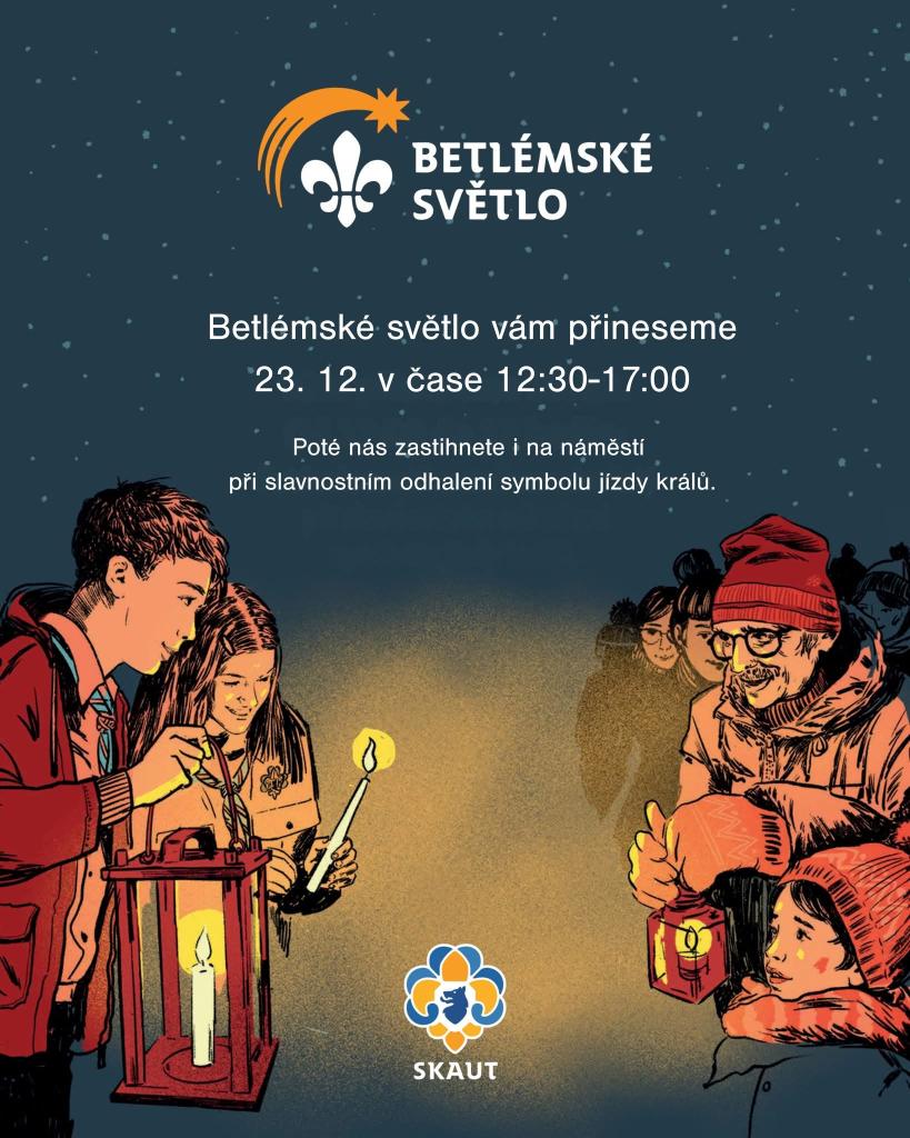 Betlémské světlo, plamínek symbolizující mír a přátelství, budeme v roznášet 23. 12. od 12:30 do 17:00. Nezapomeňte si přichystat svíčku či lucernu. Potkat nás můžete i na slavnostním odhalení symbolu jízdy králů od 17:00 na náměstí. Moc se na setkání s vámi během této předvánoční služby těšíme.