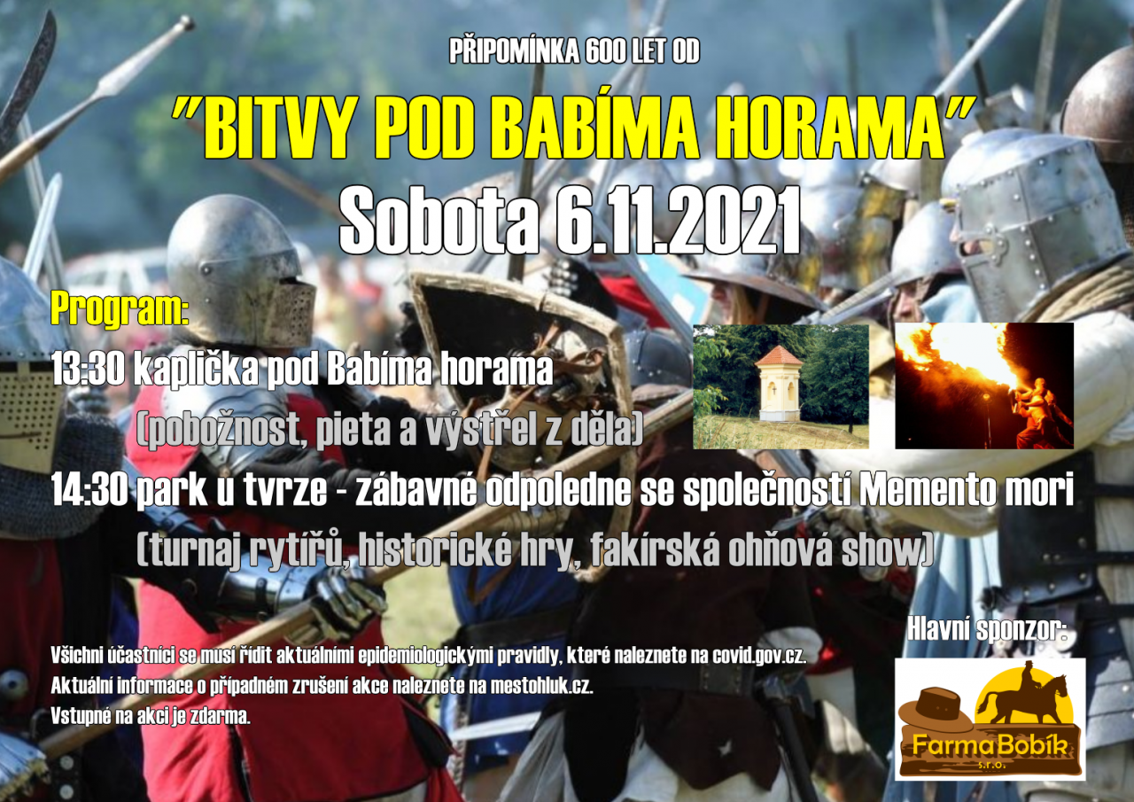 Město Hluk zve všechny malé i velké na zábavný program šermířské a divadelní společnosti Memento mori z Uherského Ostrohu u příležitosti připomínky 600 let od „Bitvy pod Babíma horama“.
