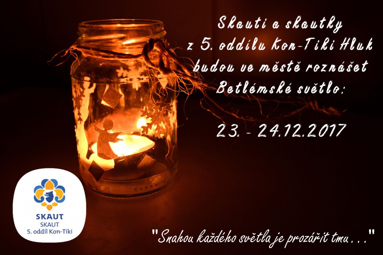 Skauti z 5. skautského oddíl Kon-Tiki budou ve městě ve dnech 23.- 24. prosince roznášet Betlémské světlo. Na několika místech města zřídili speciální krabičky, do kterých můžete vhodit připravenou kartičku, kdy si přejete Betlémské Světlo přinést.